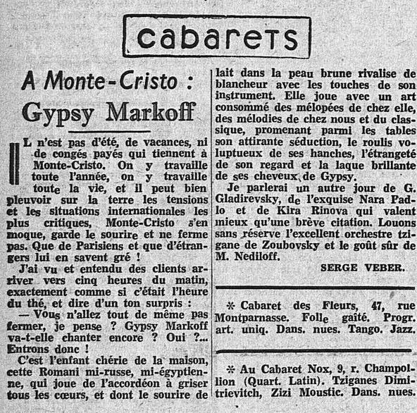 Andy, in another newsclip we have another description of the gypsy princess, called Gypsy Markoff which is not super interesting but I must admit that I didnt look for more information about her. Neither did I look for more about Nara Padlo. (especially because she is mentioned as a minor artist, who probably just had a career in this type of cabarets). I already spent so much time tracking down Galia Toumanova, which is just a minor artist, I didnt really want to do it again LOL.