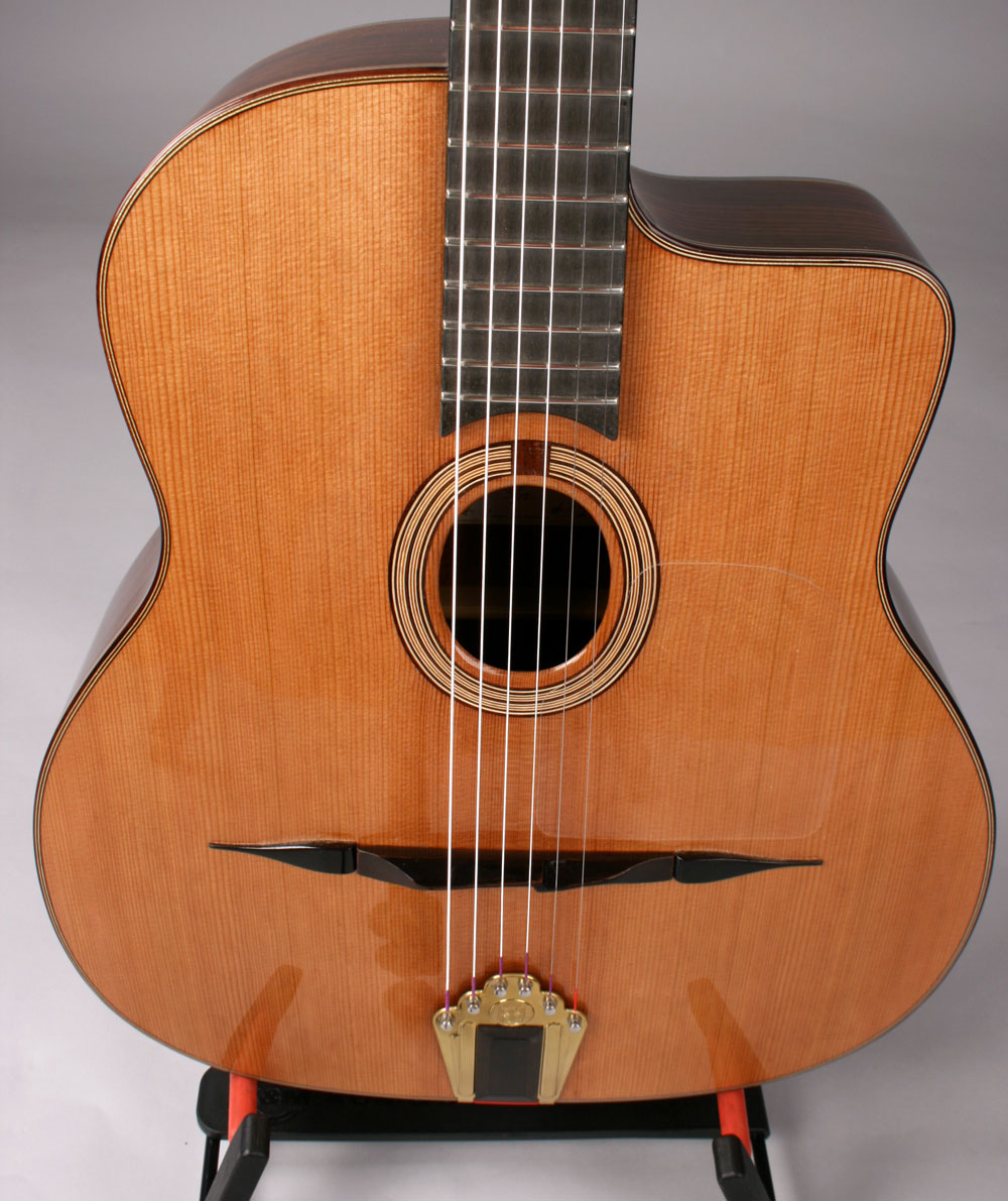 This guitar is blessed with a wonderfully open, yet poignant tone. Although not a Busato copy, it has a dash of Busato like definition, especially noticeable when playing single note passages. The frequency response has been tuned as such to allow for nice bass depth and crispy highs that don't get overwhelmed by an overly active midrange. Consequently, chords have a nice low end kick that you feel in your gut while leads remain crisp and clear. It is qualities like these that have made Bob's Modele Nouveau the favorite choice of so many of today's young virtuosos.