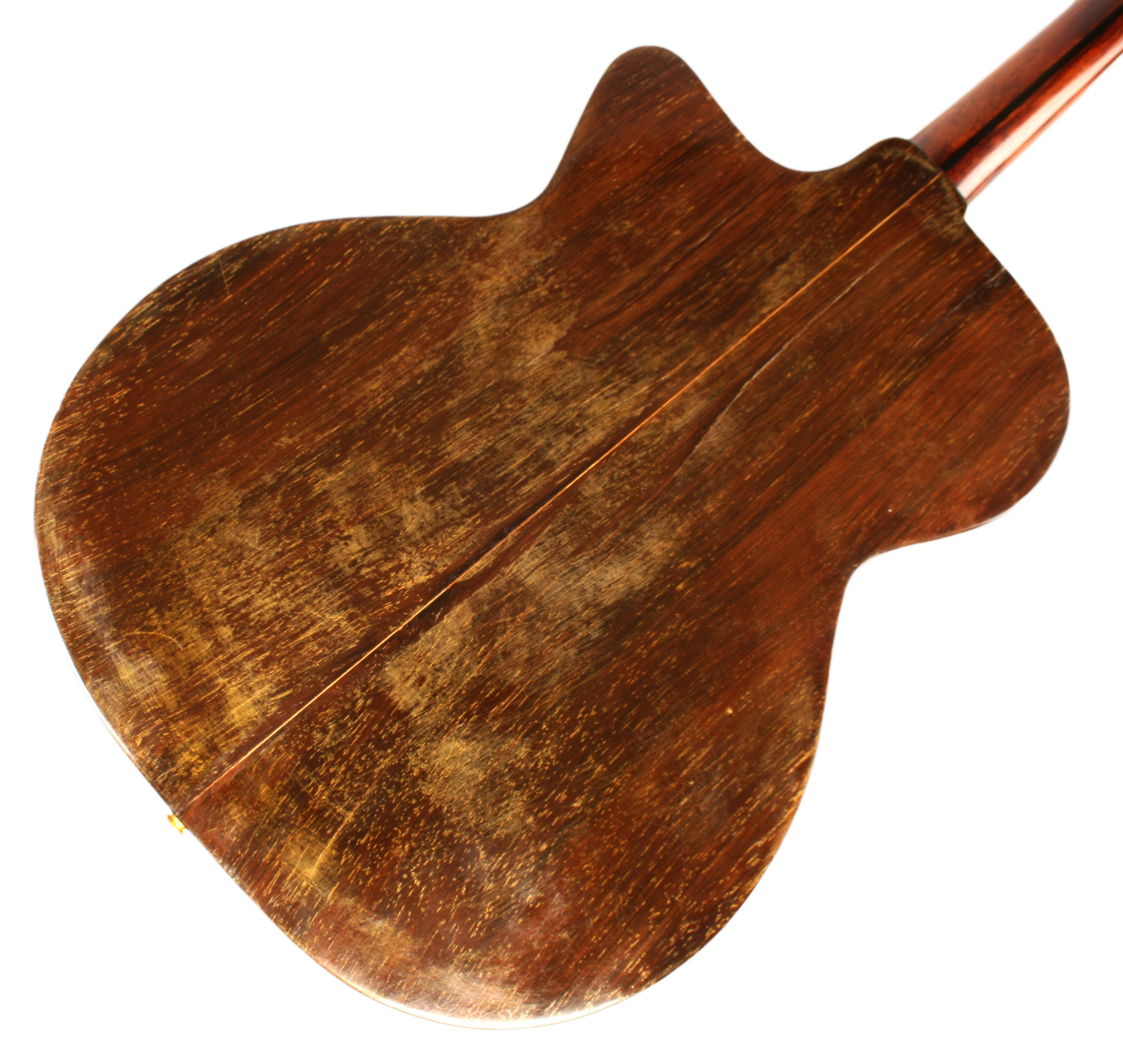 This guitar has numerous top and back cracks, some of which have been cleated, some have been glued, and others have yet to be repaired. There is one long crack that runs along the entire back of the guitar. There is also top separation on the waist (treble side).Good news is that after all these years the neck is still perfectly straight!