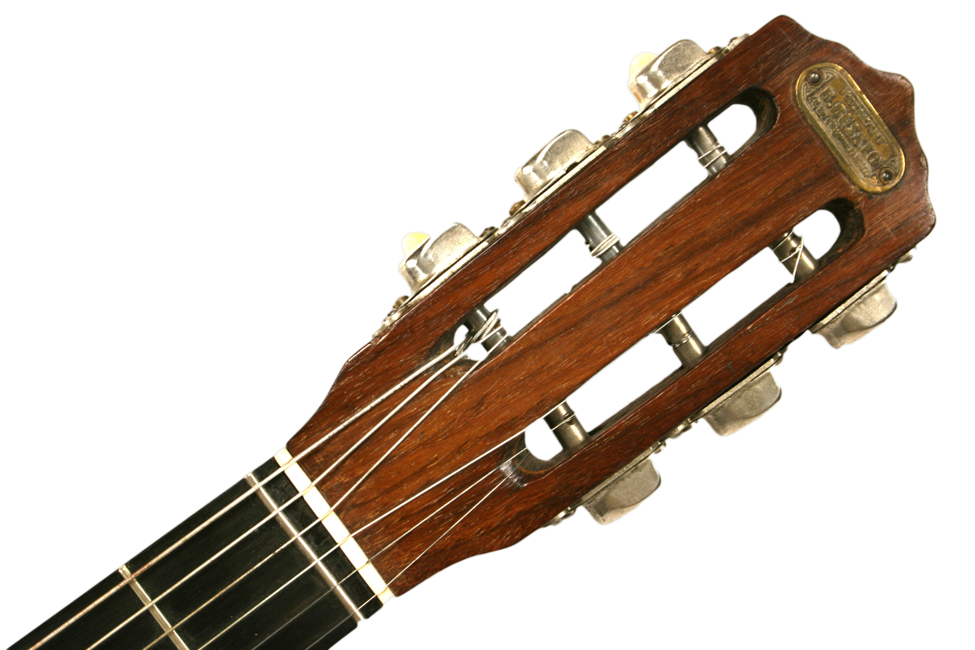 It has the original cloverleaf enclosed tuners that turn backwards. Also features some fancy banjo style fingerboard inlays.