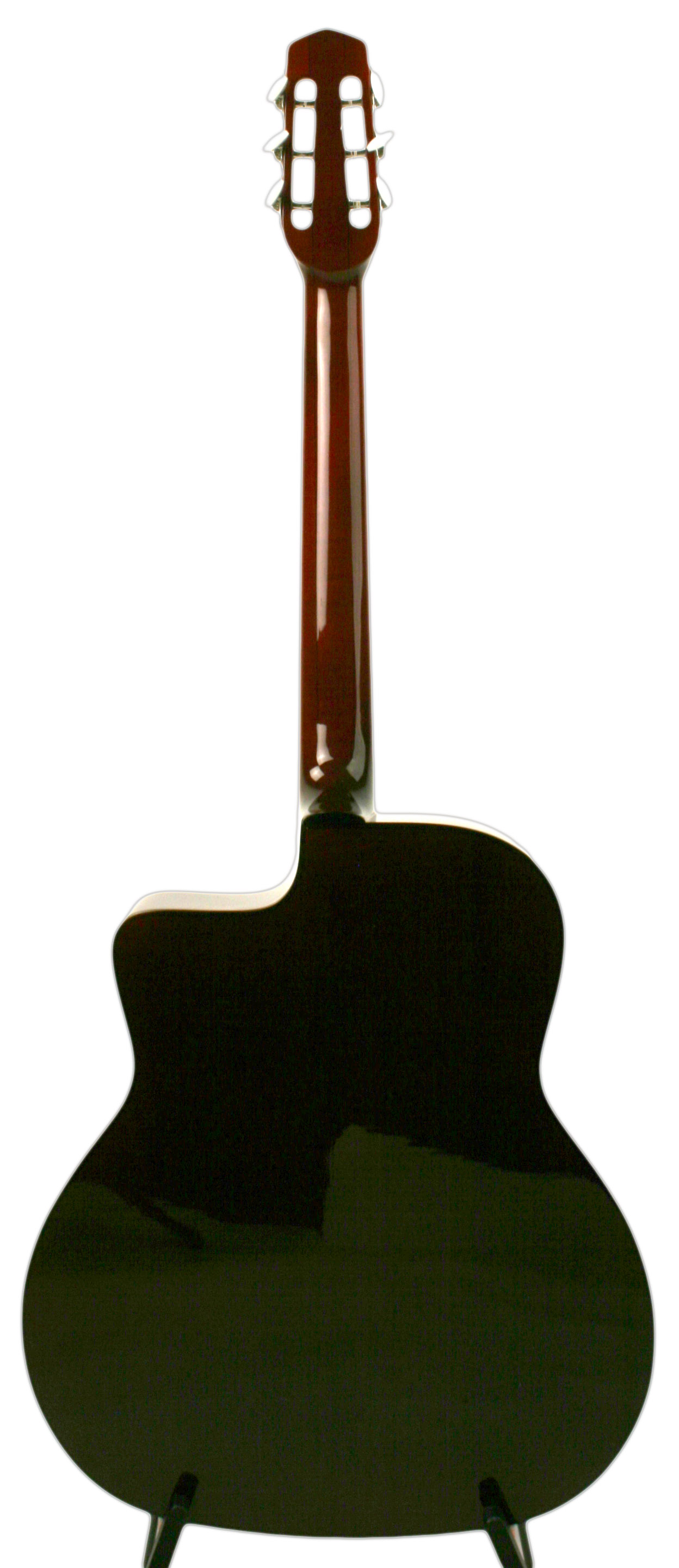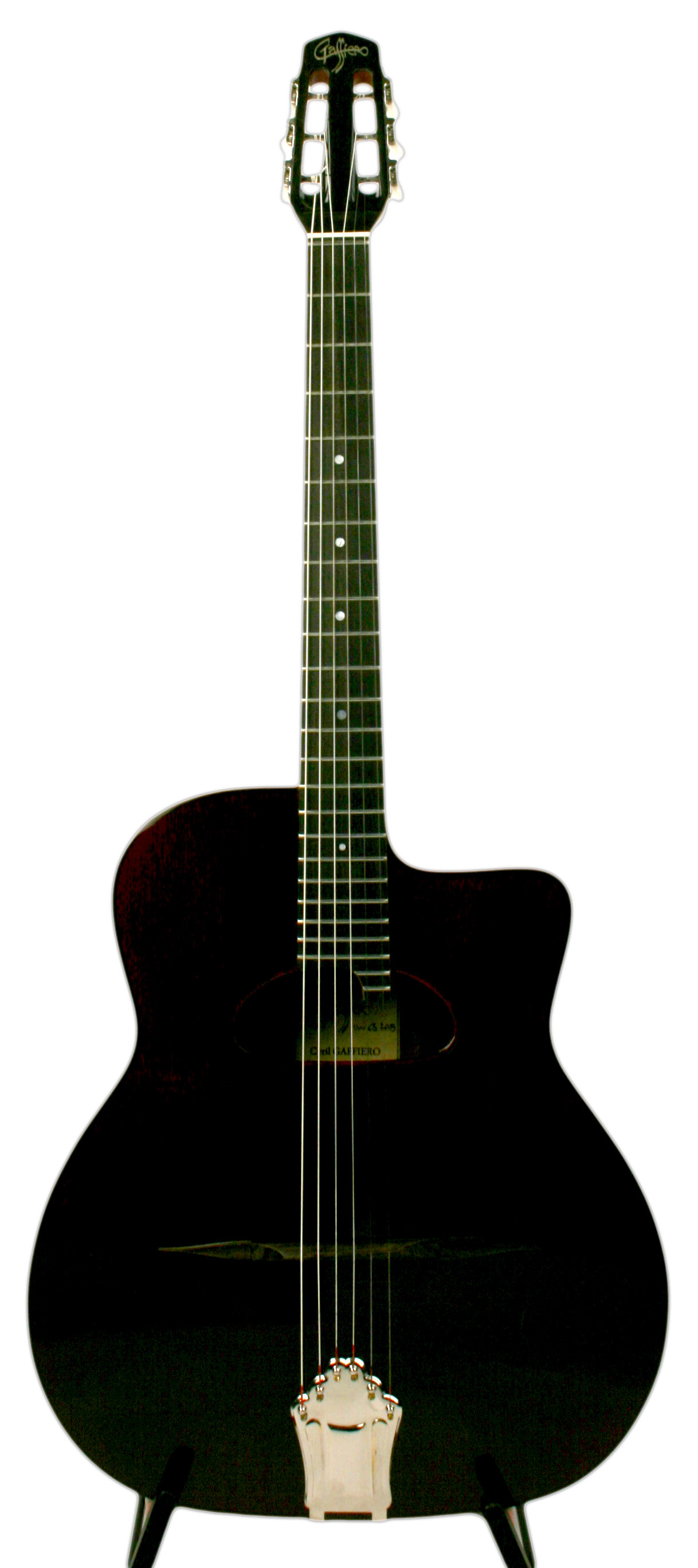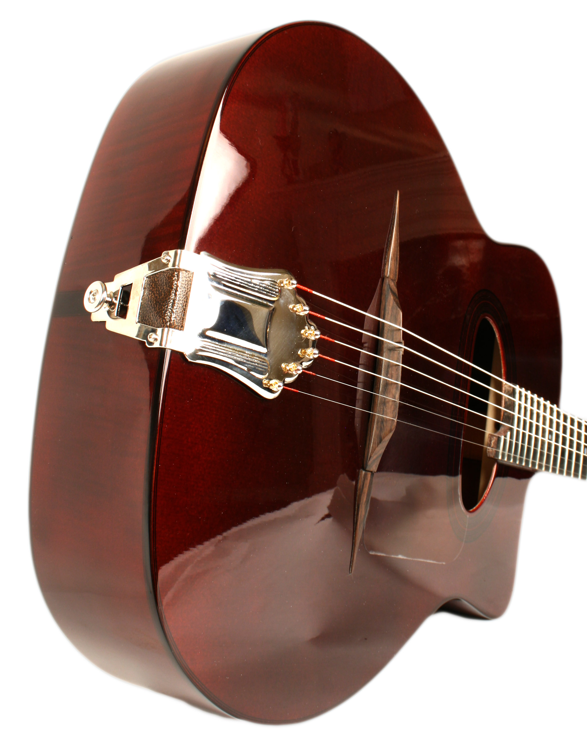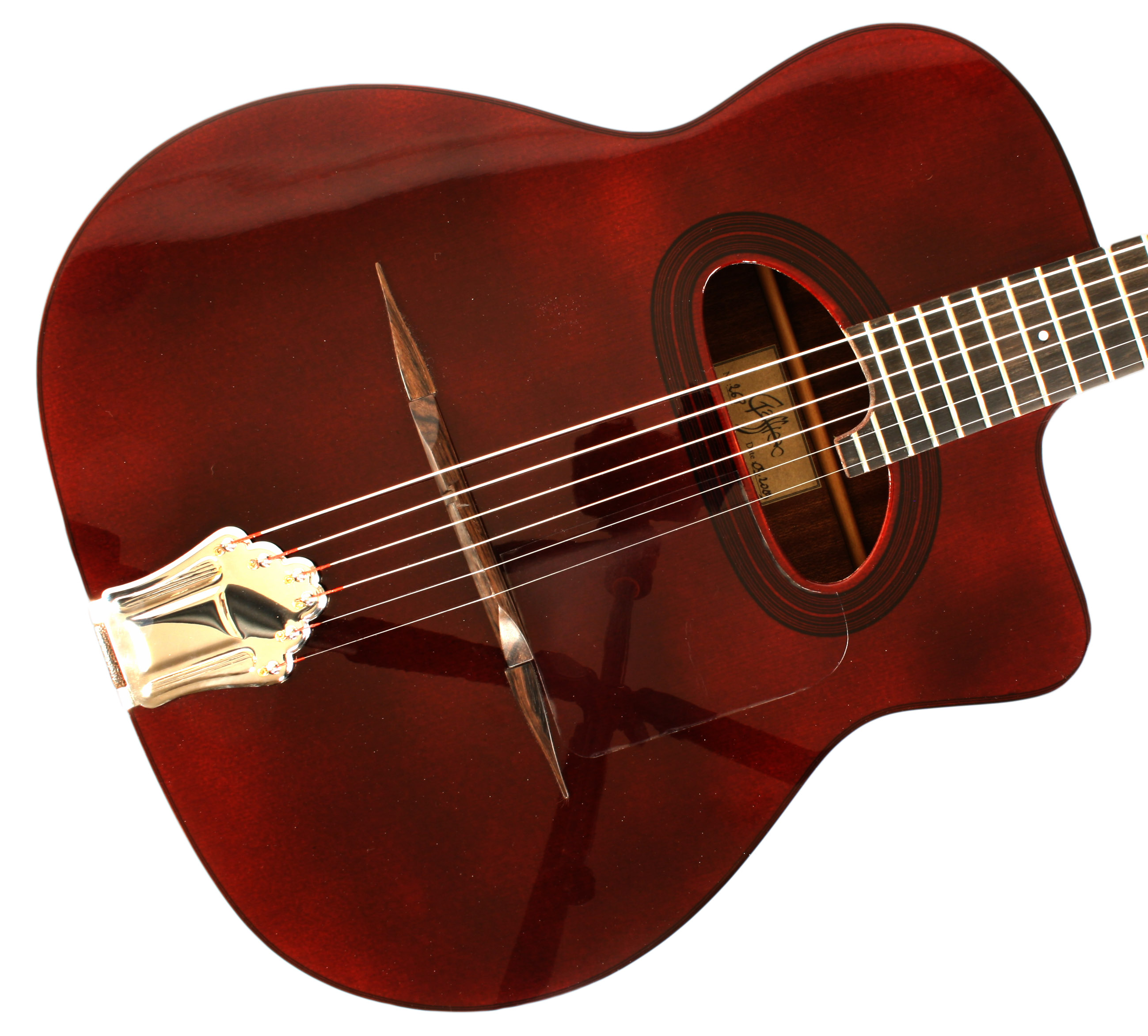 This stunning grande bouche model features a spruce top, maple back and sides, and a maple neck with twin ebony splines. Hardware includes a nickle tailpiece and a