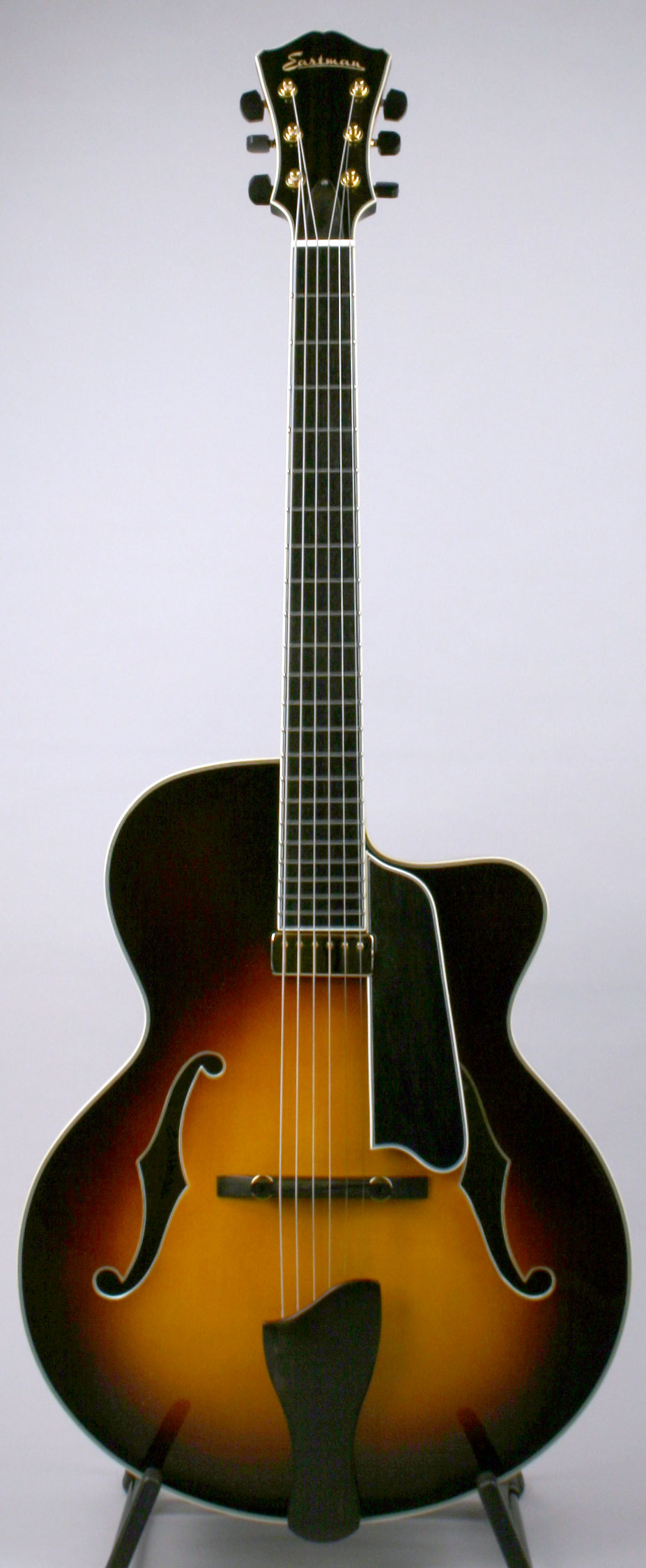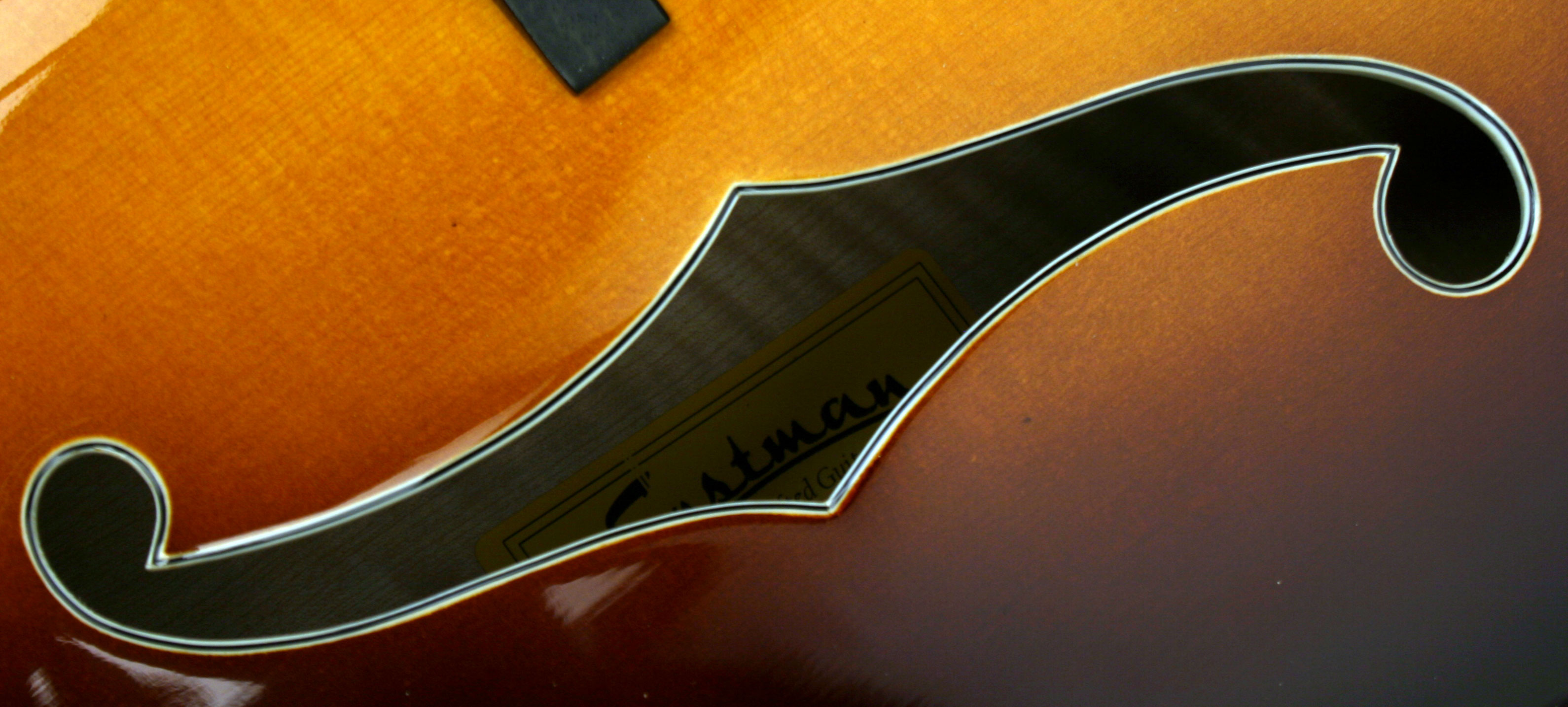 This model is an excellent choice for players seeking a stylish yet roadworthy instrument that can produce classic jazz tones at high volumes. The comfortable 16" body sits effortlessly in your lap while the floating pickup allows the top to move freely for optimal acoustic performance. This guitar comes setup with D'Addario 12 gauge roundwounds and fairly low, 2mm action. However, this instrument performs well with many types of setups, including traditional bebop (14 gauge flatwounds and very low action) and swing (higher action) setups.