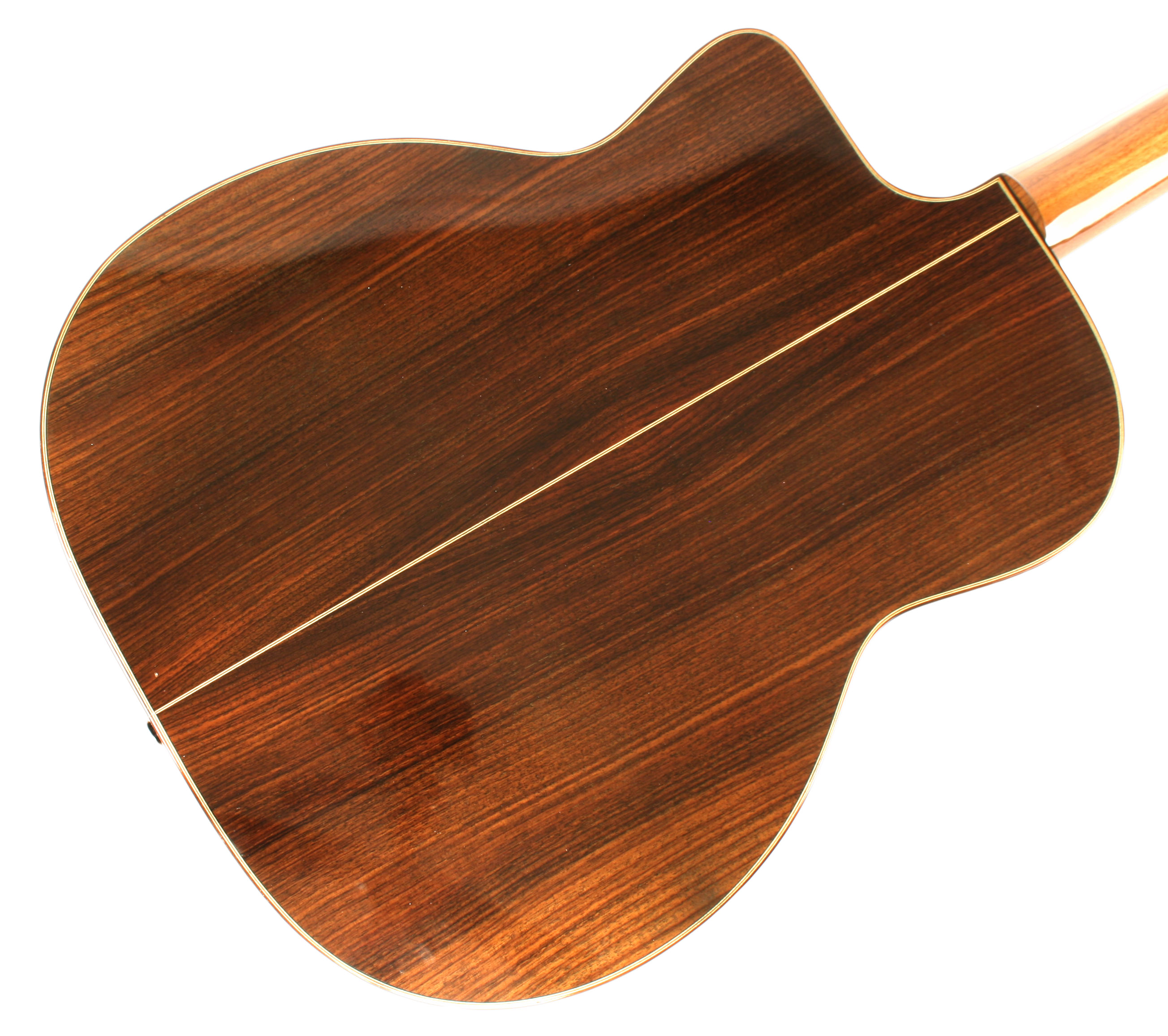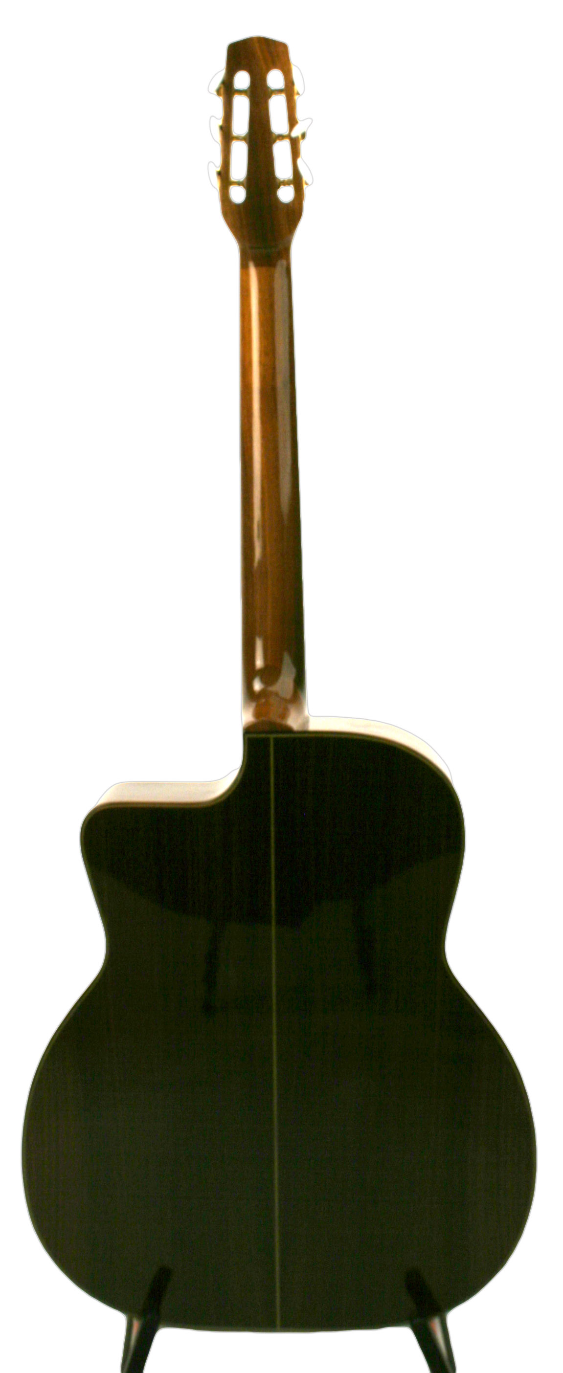 This instrument features a spruce top, Indian rosewood back and sides, and a walnut neck which has a Selmer style grafted headstock. A set of brass Schaller three on a platetuners and a brass HSC tailpiece are included