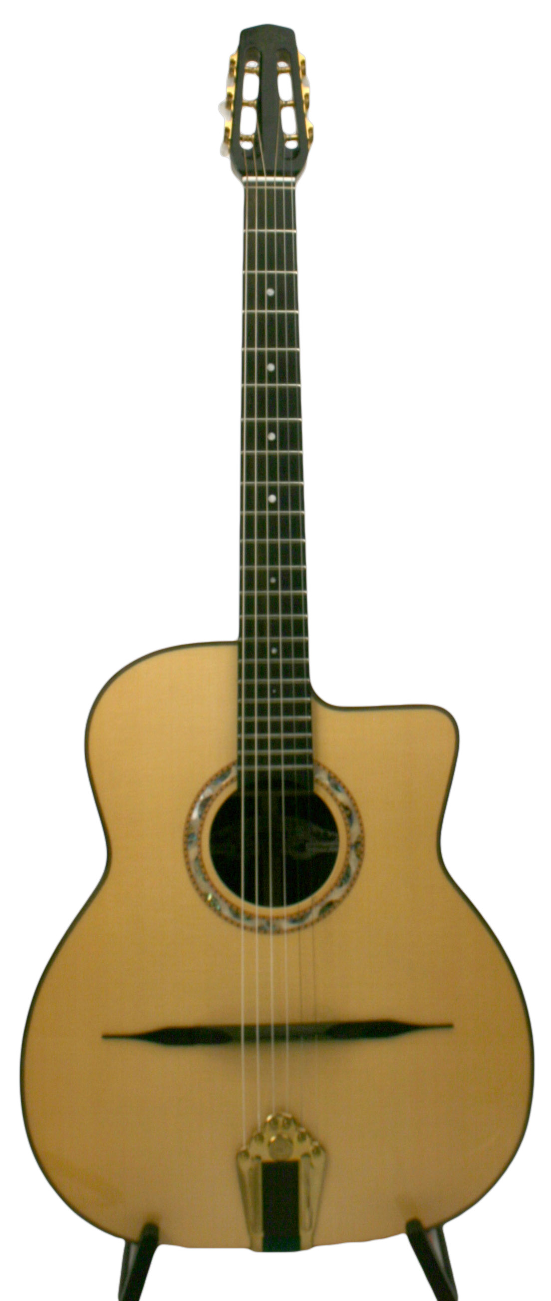 Weighing in at 4.25 lbs, this guitar is light weight and resonant. The round soundhole yields a more flatop like tone, with more bass and mids than a typical Gypsy guitar. The highs are very round and warm, resulting thick, mellifluous leads.