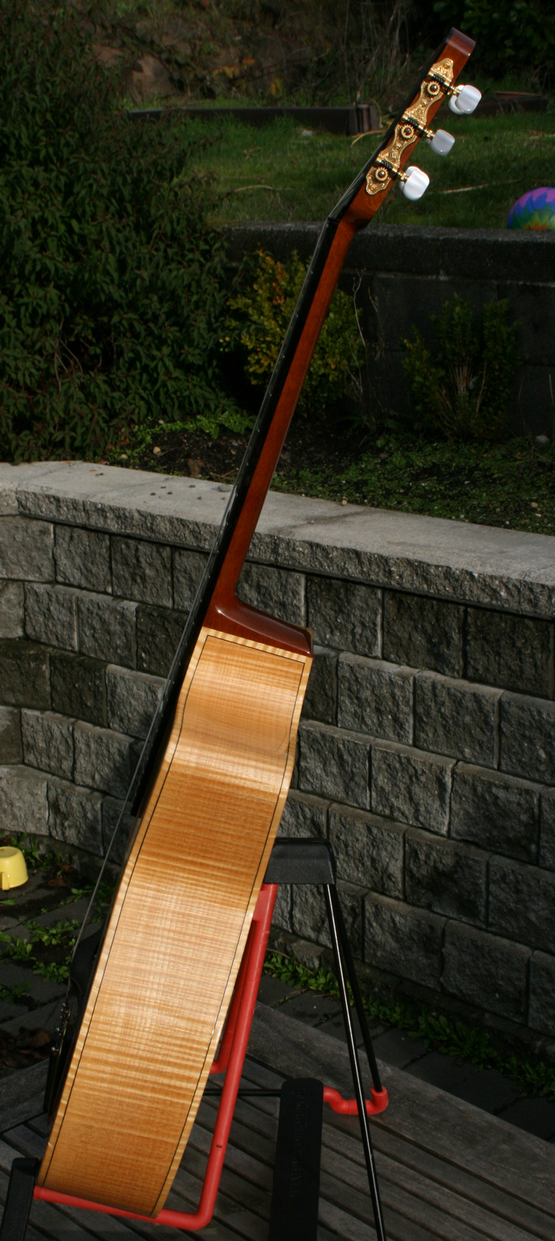 The Elan model features a short 640mm scale, 15 3/4 " lower bout, and a 4" body depth. The top is spruce, the back and sides are made of Maple. The neck is made of mahogany.