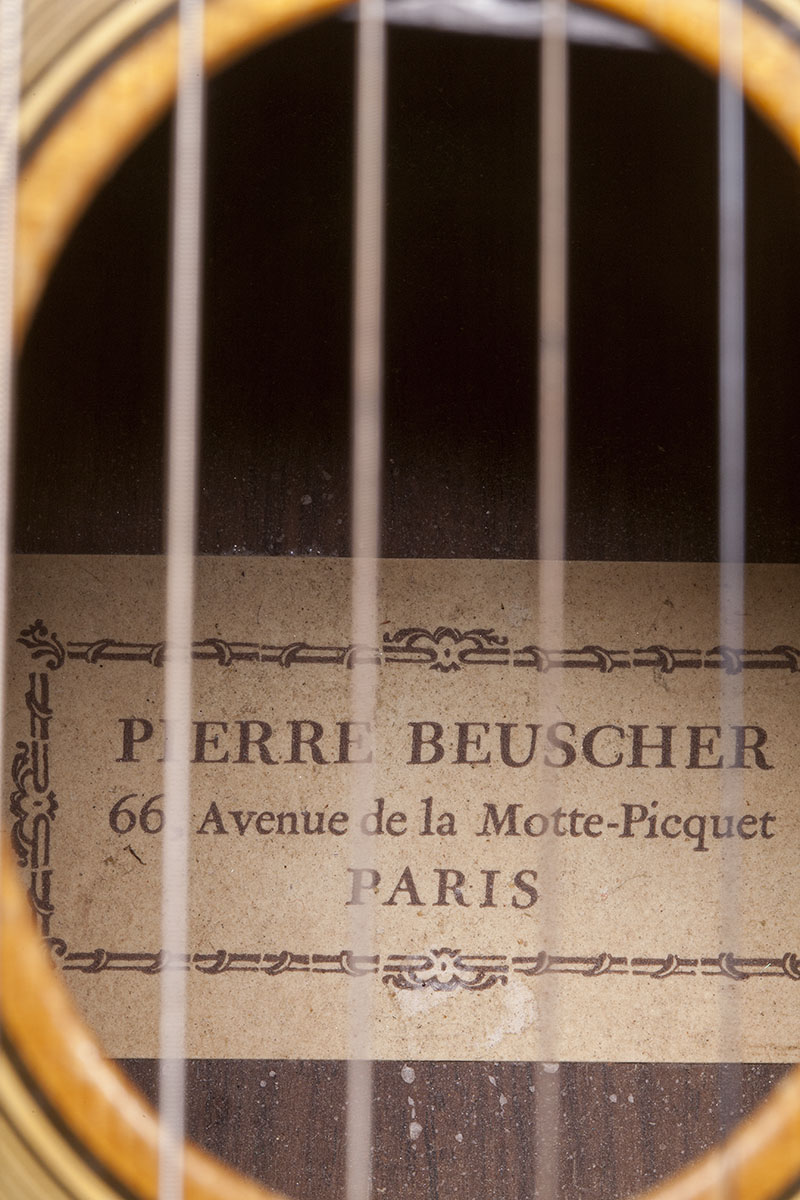 The missing link. A Favino body combined with parts from an original Selmer. The rumor is that Favino made more than one of these but we have not yet seen a photo of another one. This guitar is one of those 10 finished by Jaques Favino from the parts purchased from Selmer by Beuscher. It is featured on Tone Poems II , by David Grisman, and is pictured in the booklet. It is a fantastic sounding guitar in beautiful crack free condition. One rarely sees fine Gypsy guitars in this shape. Rosewood neck,back and sides.