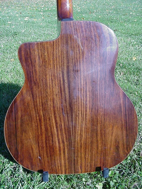 Laminated Indian rosewood back and sides.three piece maple neck with ebony fingerboard. this guitar has several hairline cracks on the top that are closed and not going anywhere.. the body has been oversprayed and the neck has been refinished..SB Tuners with metal buttons.(one button is replaced). excellent sound and playability
