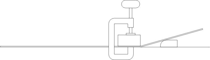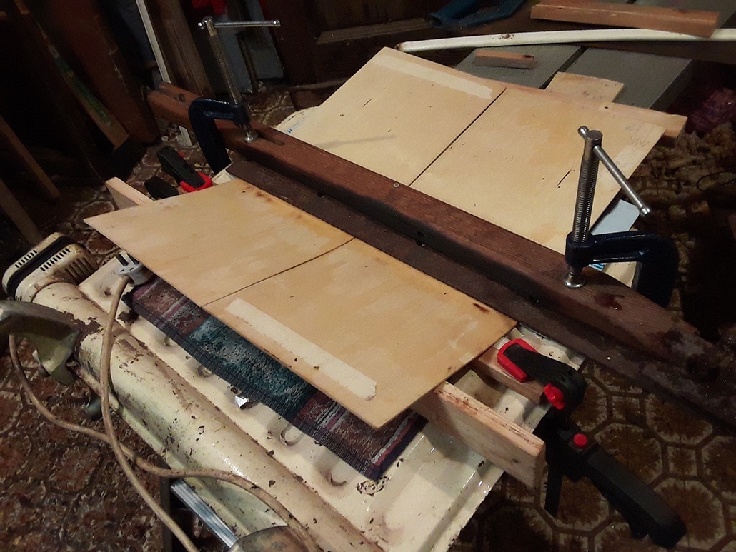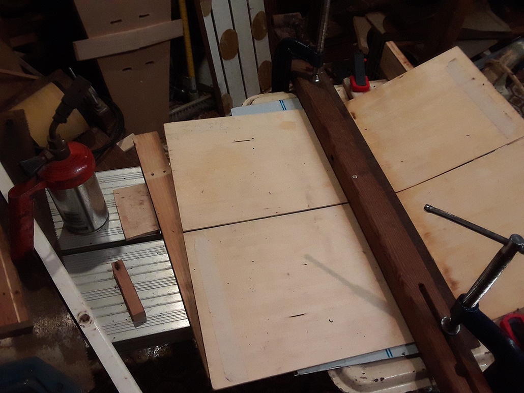 So basically all it is is the 2 halves of the top on a flat surface with a beam clamped across 'em, with another couple of slabs of wood shoved under the 'lip' to push it up..