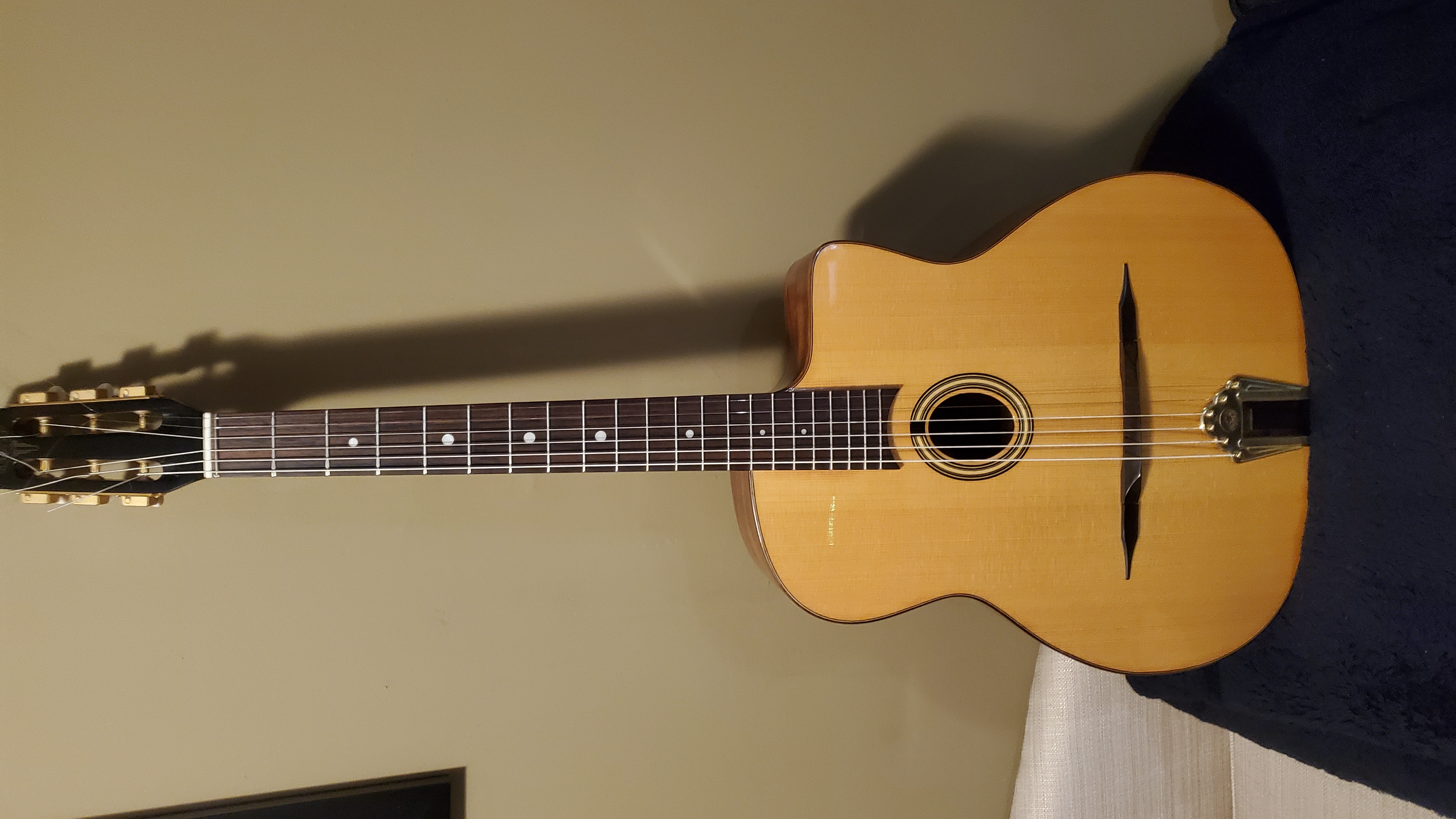 Cosmetically speaking this guitar has barely been used, the lightest of pick marks are visible and overall very good condition, no dings or cracks. Brand new Daddario gypsy strings (light) and a roadrunner hard poly case to keep her safe in travel. The only thing that sucks about this guitar is that it is not in your house.