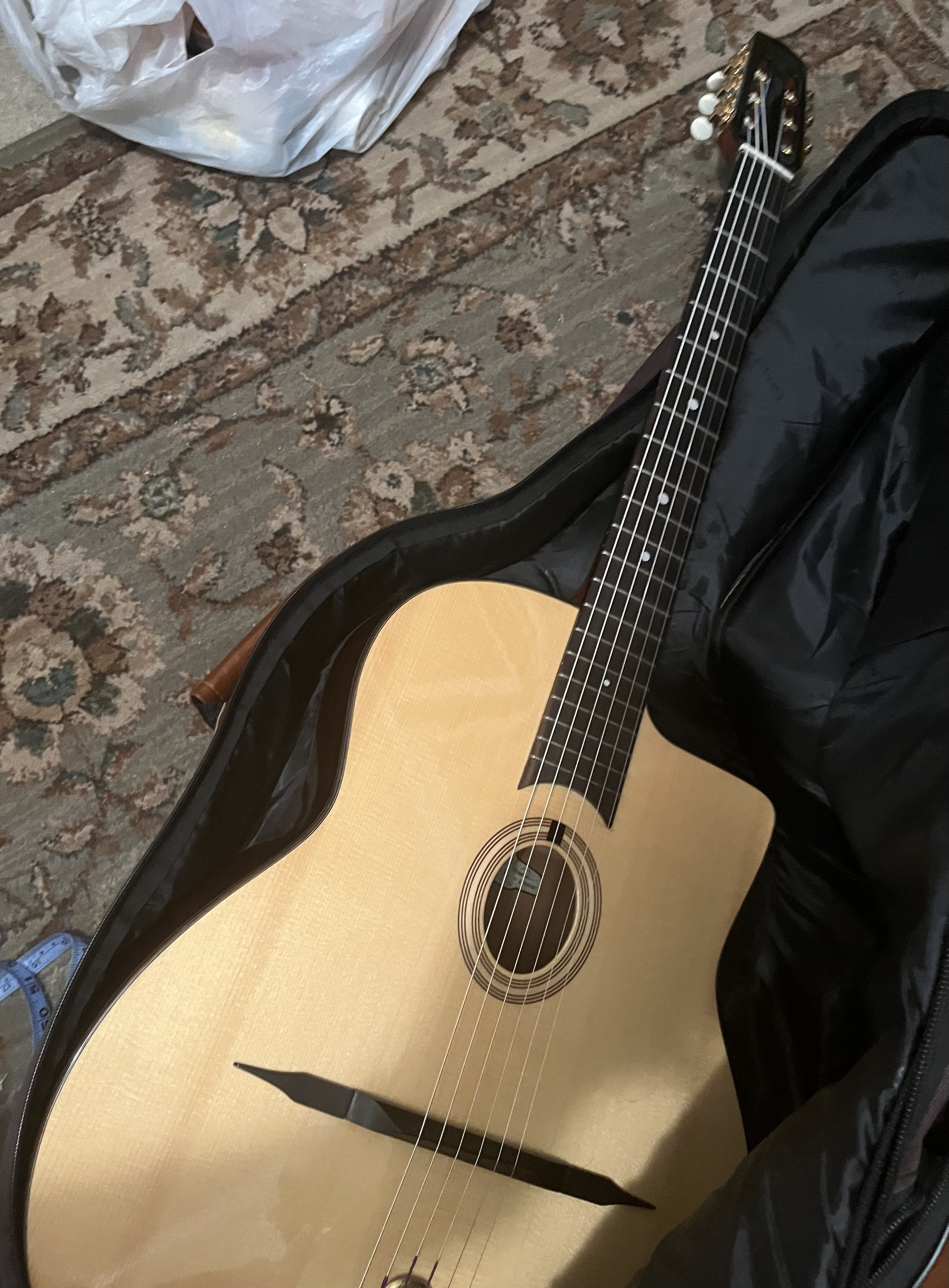 Since I now I have two great guitars, I want to diversify a little bit. I gave the edge, very slight edge, to keep my Gitane for my petite bouche guitar and am looking for a long scale, 14 fret, D hole guitar of similar value. (even a little less value is ok if it is what I am looking for). My guitar is in great shape with a slight amount of wear from playing, hard to find pick marks and dings.