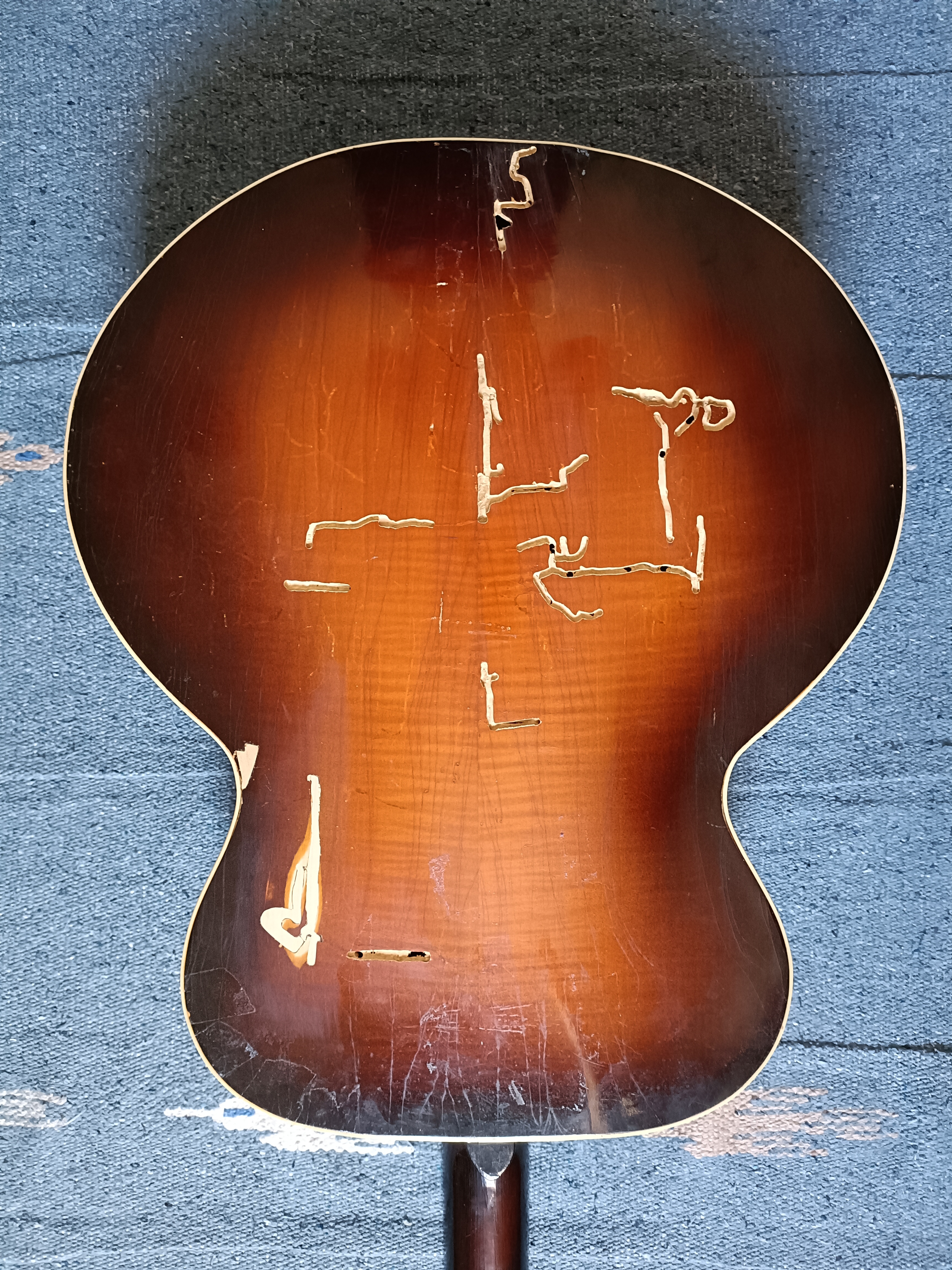I have nothing but admiration and gratitude to those other members who take some of these old project guitars that look hopeless and return them to playing condition. How does this guitar sound by tapping on it? Good resonance? It is indeed unfortunate for the woodworm damage. Makes me wonder if it was just hanging in a garage or attic or some other inhospitable place for a guitar to allow that to happen. It does seem to be a little more cosmetic than structural so hopefully that is ok. How about the upper bout though? Looks like it had a significant crack that has the start of a repair (and a lot of adhesive tape residue!)