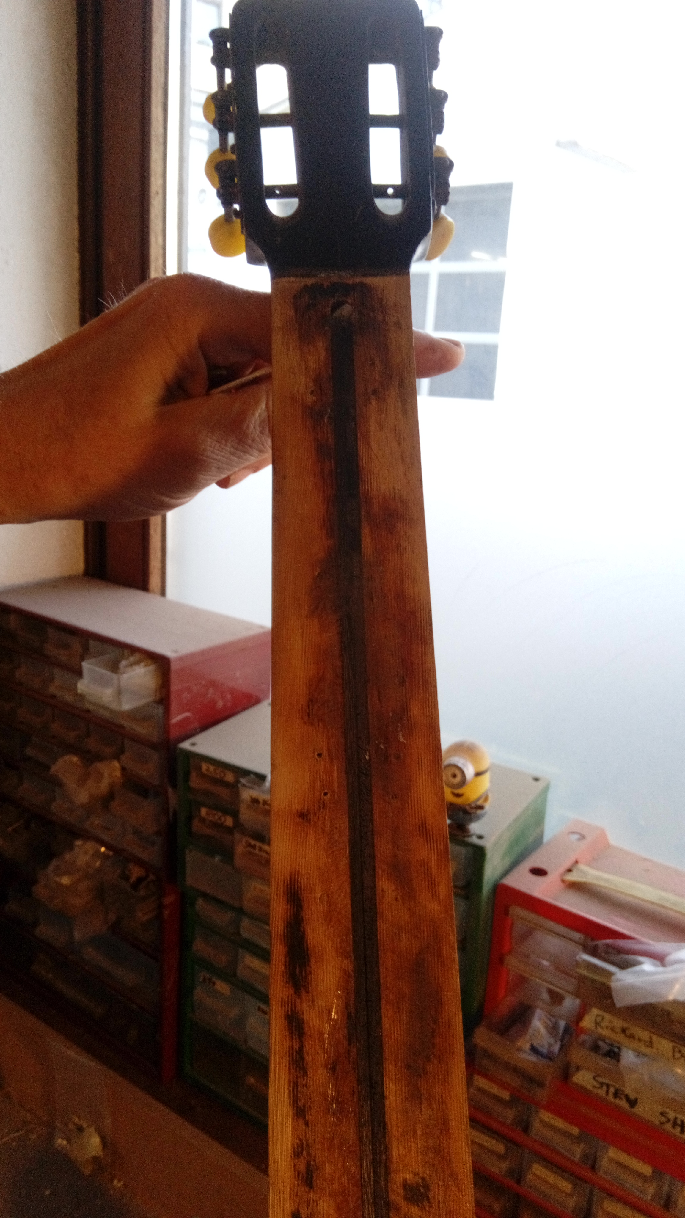 I confused two guitars; lamb's tail ment the neck of an old cheap archtop, twisted in two directions. The Patenotte neck just didn't withstand the pull of the strings and was bent forward. Karsten bent the neck back and put in the carbon rods to stabilize it.