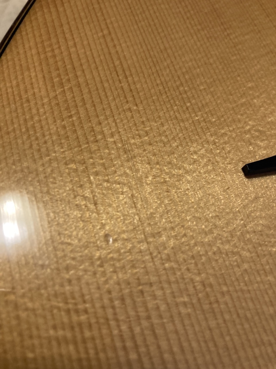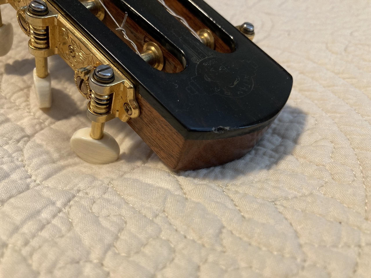 For its age, the guitar is in really good condition. The top of the head has been dinged and you can see that in the 2 images of the head from different angles. There is one slight depression on the top near the upper moustache end (about the size of bic pen head). You can see this in a zoomed in picture and in the lamp glare of the top picture on the bed. A similar sized depression exists on the top side of the neck around the 3rd&4th fret. I tried to catch it in the glare, but otherwise very difficult to notice by sight. Those would be the largest marks. Anything else might be typical wear. There is no damage to the top finish near the high strings as is sometimes seen on these guitars. Some wear to frets as expected.