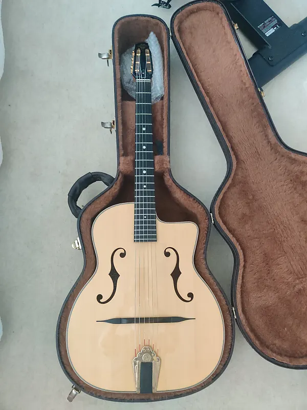 Also, you're right, I don't see the pick-guard. I wonder if it's so invisible because the body of the guitar is light. Mine is darker (see pic below). I got it used from forum member in Canada who's had it for years. He said he ordered it from overseas, so my deduction is it came from the shop of the now-retired luthier in England. There's a Youtube video from Irene's Adventures where she visits the shop and interview the builder. The new luthier who took over the business does not seem to offer this model any more.