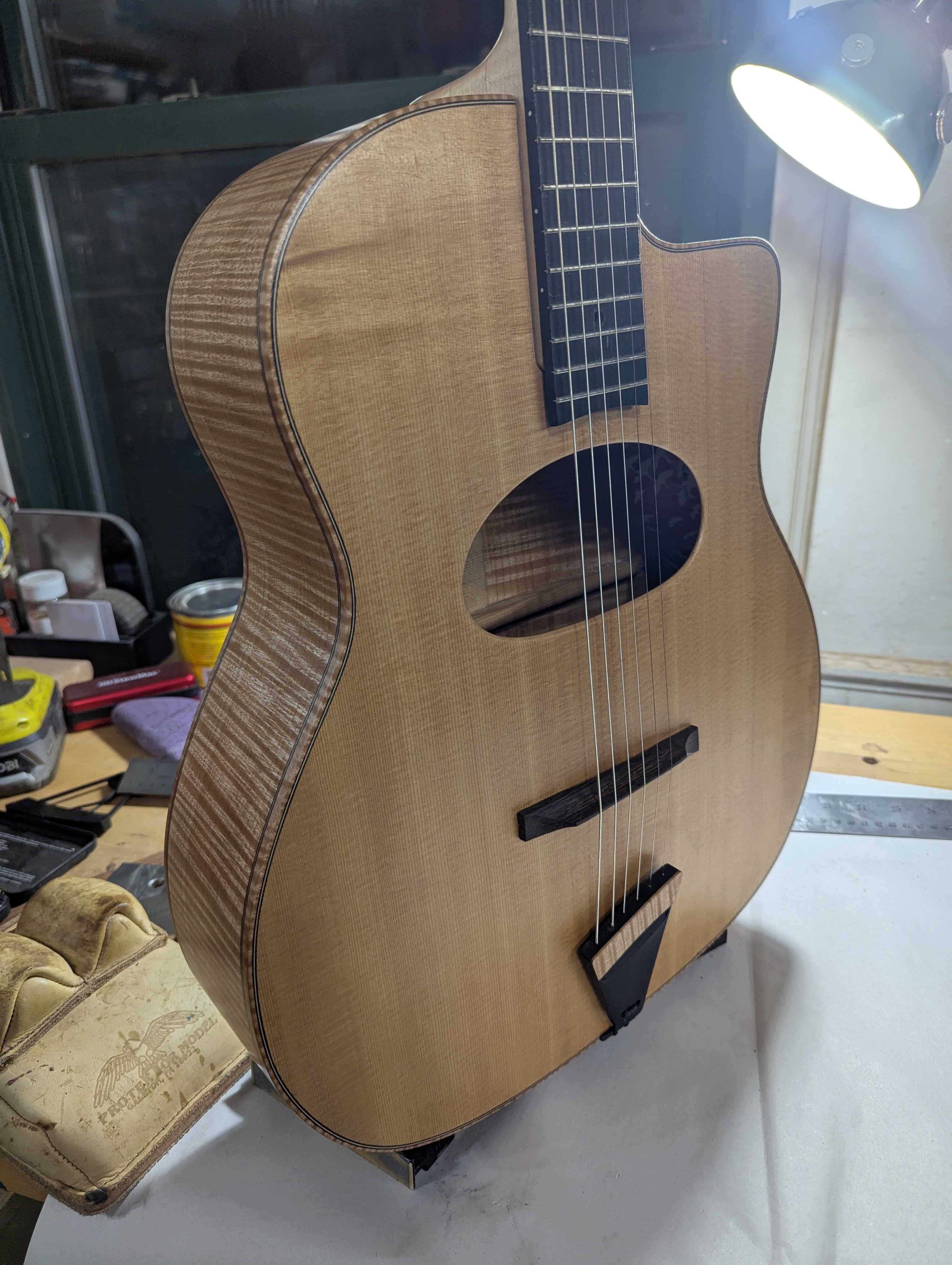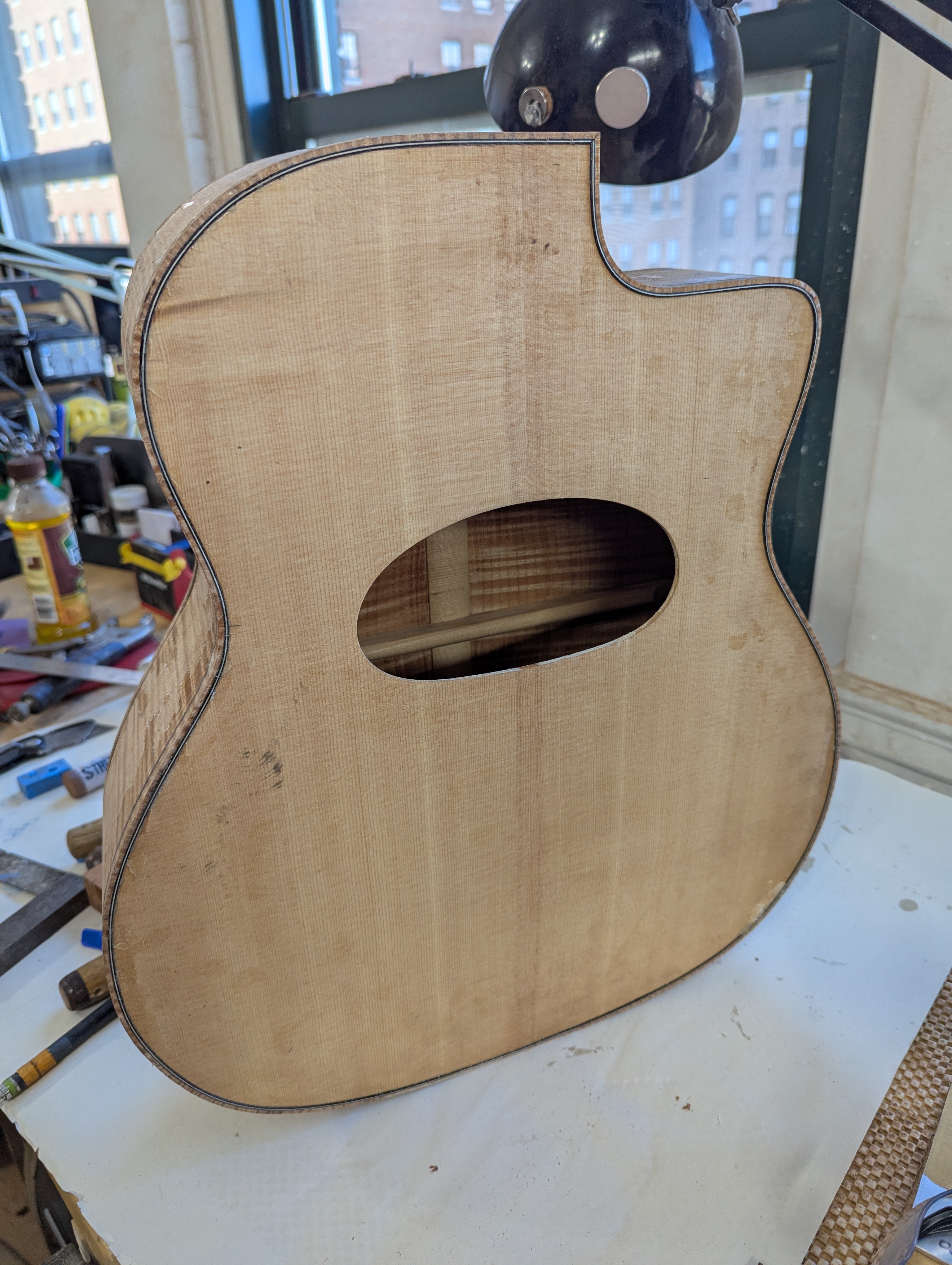 More traditional D-hole shape? I really like the clean unbound soundhole opening. And I'm a fan of the tailpiece too. Cool guide for drilling through top for the string openings. I do miss the look of the mustache pieces but I'm slowly getting used to it. No logo yet? McEvoy on the headstock would look good.