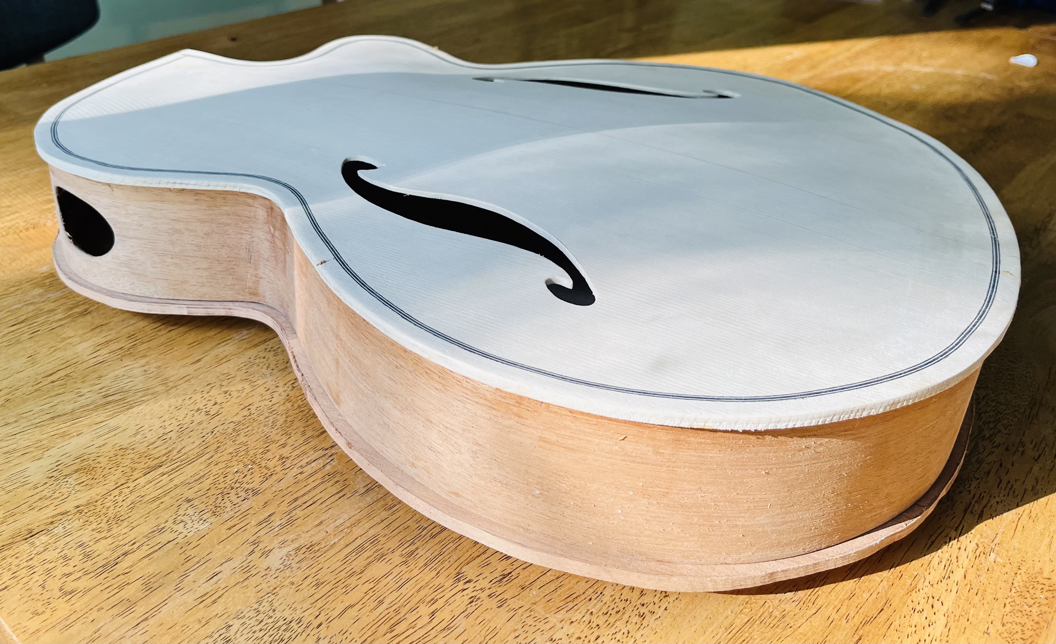 I am working on a 16” cutaway. The body is pretty well wrapped up. Working on the neck now.