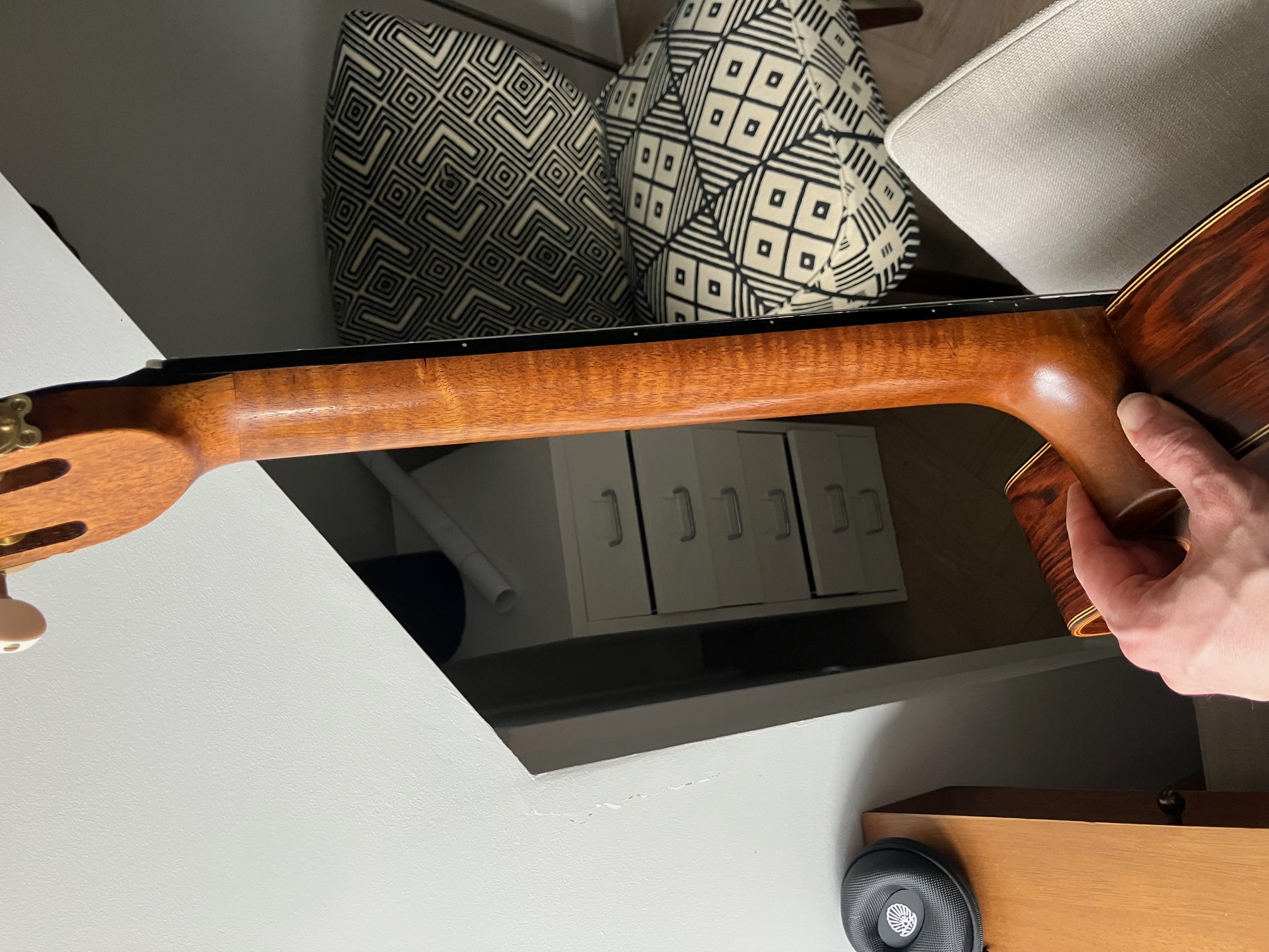 A great example of this great guitar from AJL, which is rare in the UK. Note the figured walnut neck as well as the beautifully figuring on the Brazilian rosewood back and sides