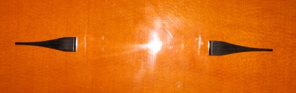 As received, a couple of items were of immediate note. The tail-piece had some minor corrosion and looked "cheap." A quick pass under the buffer took care of the stains and made it look quite respectable. The mustache bridge ends, while obviously ebony, had square edges that also struck me as what one might expect on an inexpensive knock-off. Rounding the edges a bit before gluing would improve their appearance. Also, the mustache ends were unevenly clamped, resulting in sharp indentations in the spruce top at their tips. I took a look under a magnifier and determined that the top had not cracked at these places. The movable portion of the bridge would have benefited greatly from being contoured to the top. Under string tension for nearly two years the outer edges of the feet had deformed the top, again almost cracking it. I immediately sandpaper-shaped the bridge to the top, hoping to avert disaster as the guitar acclimated to our 50-55% relative humidity. Also, the string notches were sloppy and not of the correct depth. They appeared as if made with a pocket knife.